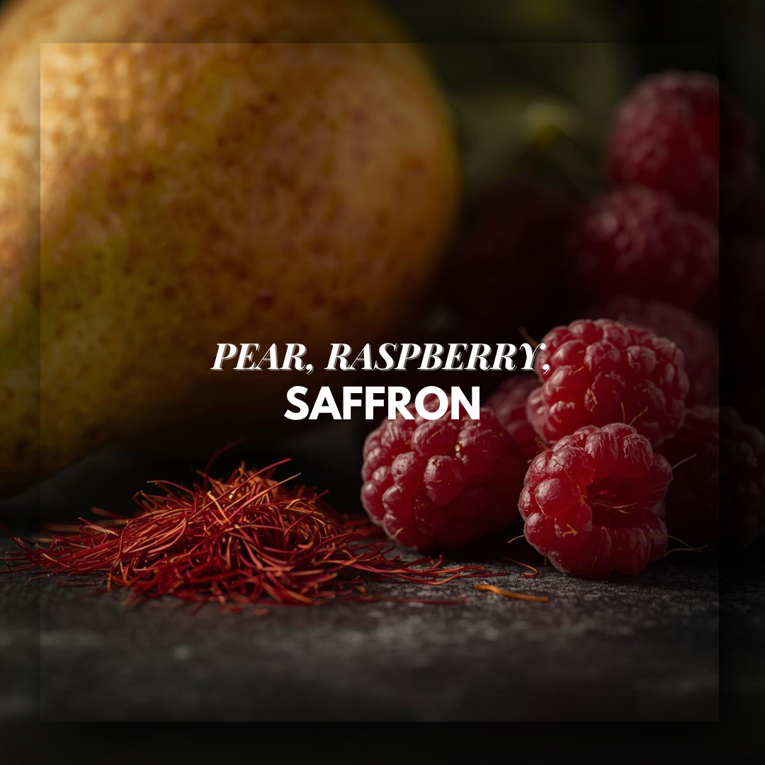 Notes: Pear, Raspberry, Saffron • Bulgarian Rose, Orange Blossom • Patchouli, Amber, Oud